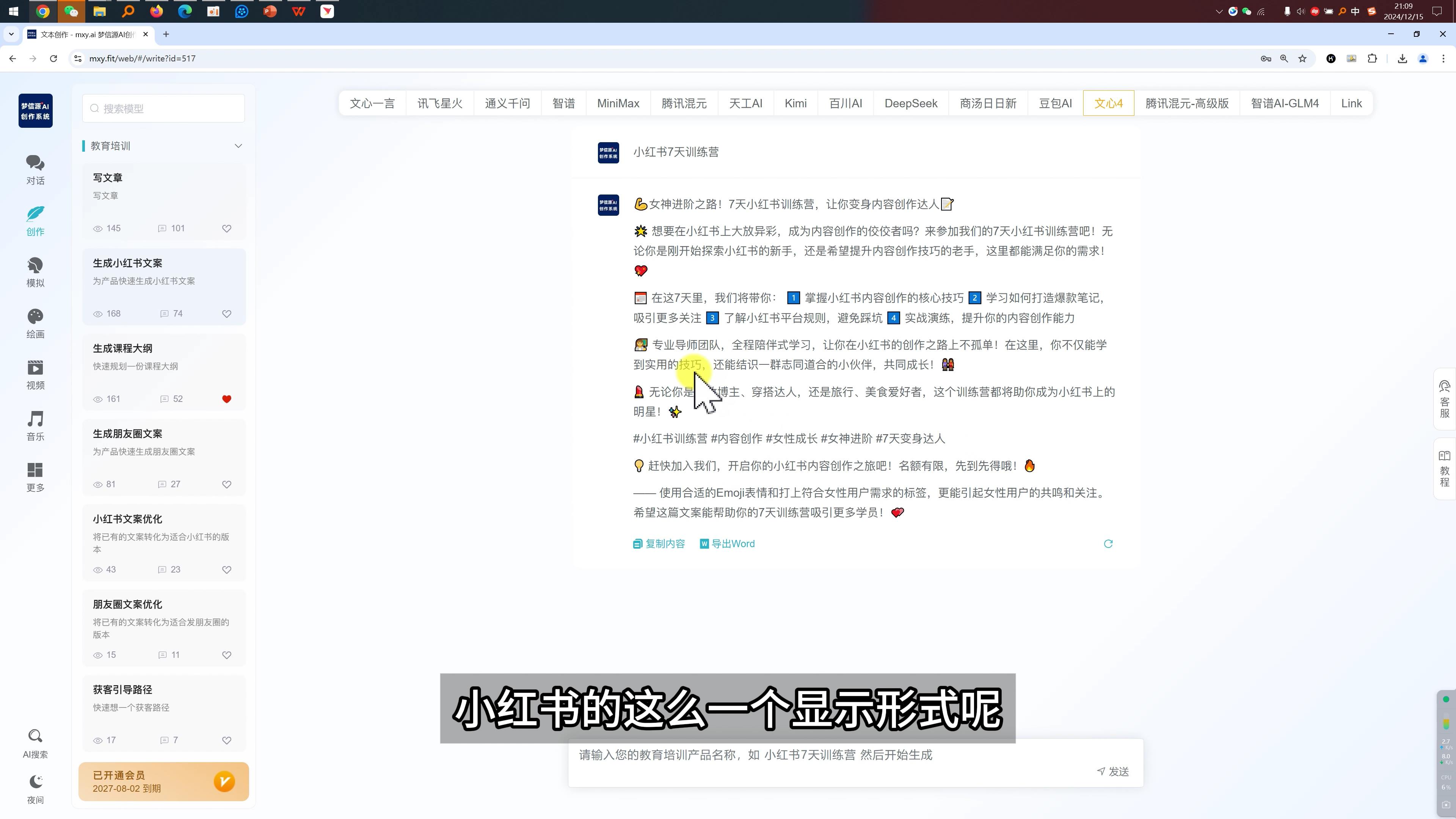 比如说,当我选择了这个生成小红书文案、那么我们去输入文字点击发送之后、他就会按照小红书常见的这些格式