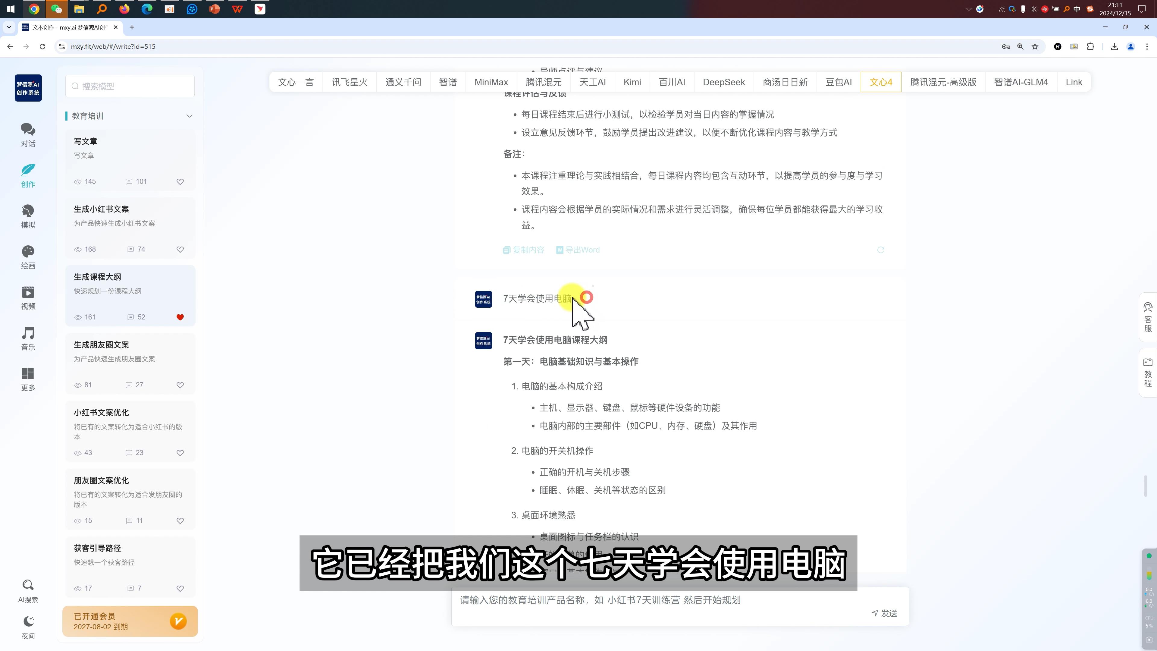 好的现在我们就看到,使用梦信源AI创作系统 https://www.mxy.fit 它已经把我们这个七天学会使用电脑的大纲给我们列出来了